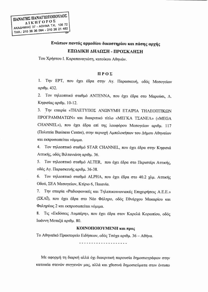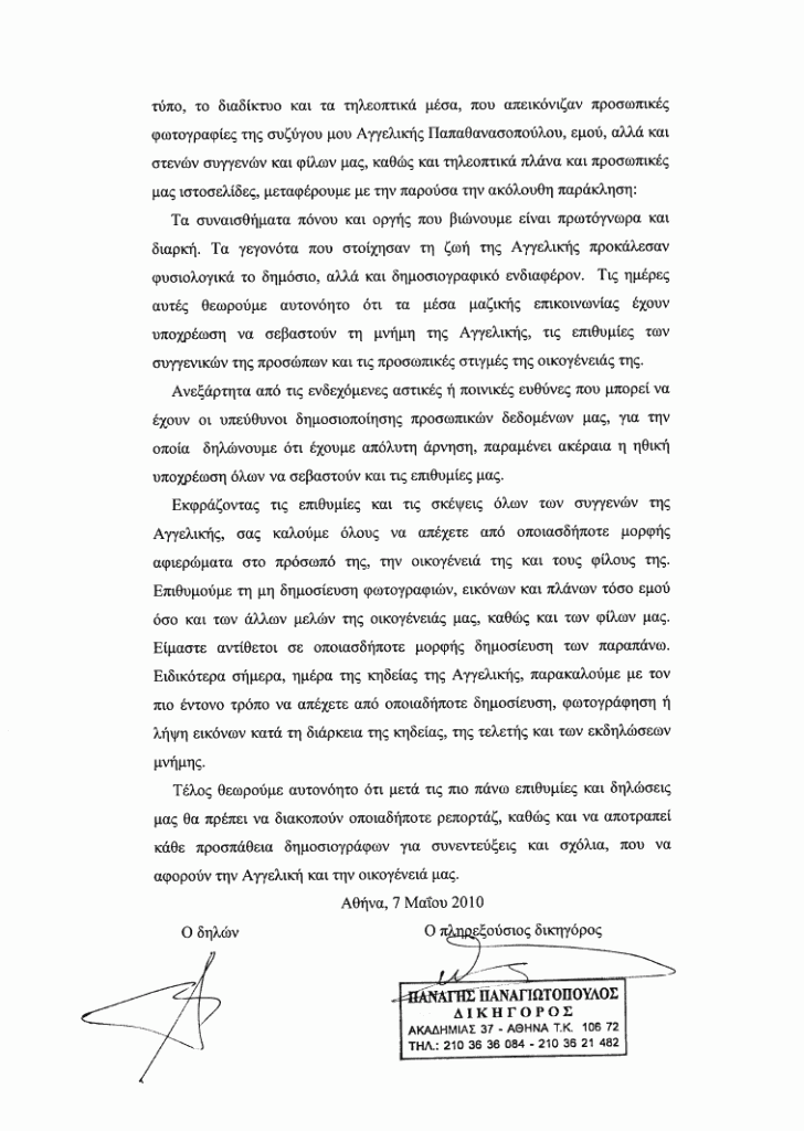 Εξώδικο έστειλε ο Χρήστος Καραπαναγιώτης σε τηλεοπτικούς σταθμούς αλλά κι έντυπα, προκειμένου να πάψει να υπάρχει η παρουσία των τηλεοπτικών μέσων σε σπίτια συγγενών της άτυχης κοπέλας αλλά και να πάψουν να δημοσιεύουν φωτογραφίες από την προσωπική τους…
