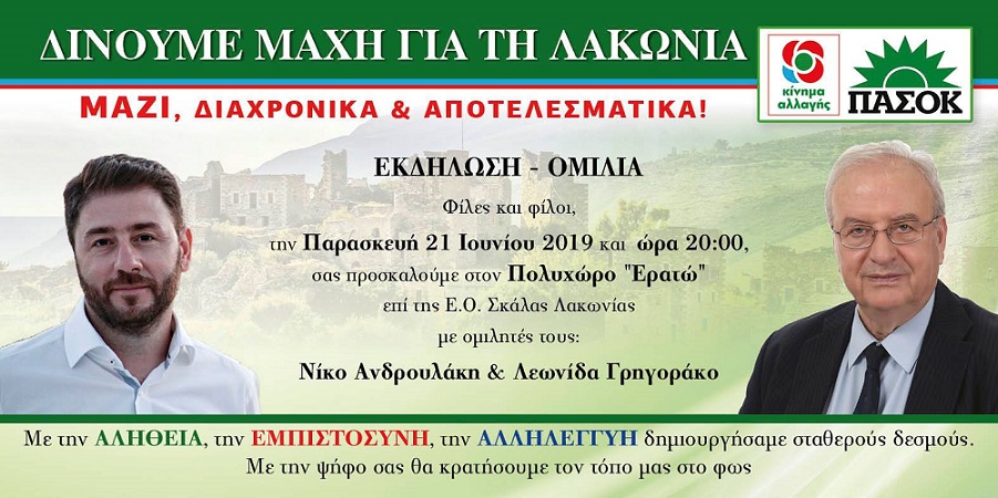 Η Νομαρχιακή Επιτροπή του Κινήματος Αλλαγής Λακωνίας, ανακοινώνει ότι την Παρασκευή 21 Ιουνίου 2019 και ώρα 8 : 00 μμ, θα πραγματοποιηθεί προεκλογική εκδήλωση στο κέντρο « ΕΡΑΤΩ », επί της Εθνικής Οδού Σκάλας – Βλαχιώτη Λακωνίας, με ομιλητές: