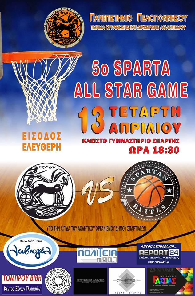 Σήμερα Τετάρτη 13/4 και ώρα 18:30 στο κλειστό γυμναστήριο Σπάρτης πραγματοποιήθηκε το 5ο Sparta All Star Game ανάμεσα σε επίλεκτους φοιτητές του ΤΟΔΑ και αντίστοιχους απο μικτή ομάδα όλων των μπασκετικών συλλόγων της Σπάρτης.