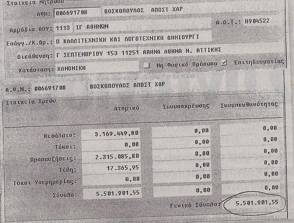 Μετά το αποκαλυπτικό δημοσίευμα της εφημερίδας Ελευθεροτυπίας ο Τόλης Βοσκόπουλος χρωστάει στην εφορία ούτε λίγο ούτε πολύ 5,5 εκατομμύρια ευρώ….