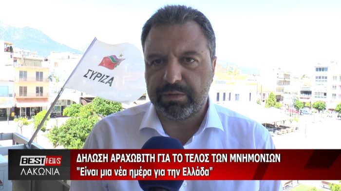 Για μια νέα εποχή για την Ελλάδα κάνει λόγο στην συνέντευξη που παραχώρησε στον Γιάννη Παυλάκο ο βουλευτής Λακωνίας του ΣΥΡΙΖΑ Σταύρος Αραχωβίτης μετά και το σημερινό διάγγελμα του Πρωθυπουργού Αλέξη Τσίπρα για την έξοδο της χώρας από τα μνημόνια.