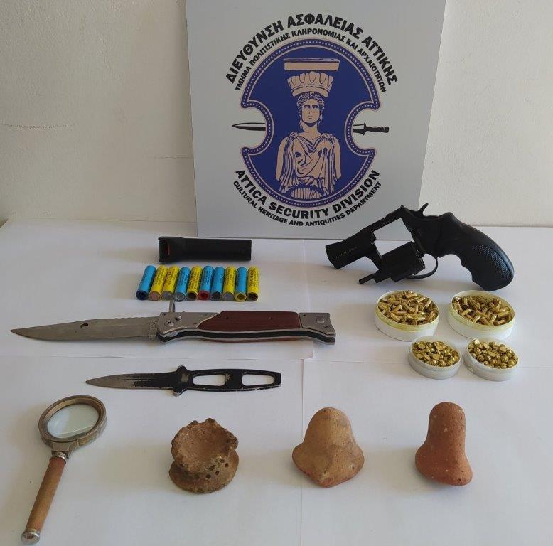 Παράλληλα βρέθηκε ένας ανιχνευτής μετάλλου, ένα περίστροφο εκτόξευσης φωτοβολίδων, πτυσσόμενο μαχαίρι στρατιωτικού τύπου, μεταλλικό μαχαίρι, 378 φυσίγγια κρότου και άλλα αντικείμενα που αποδείκνυαν την παράνομη δραστηριότητά του.