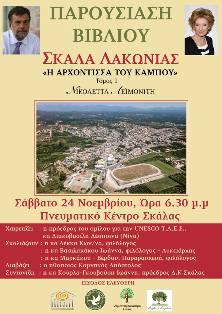 Ο Σύλλογος “ΝΕΟΙ ΟΡΙΖΟΝΤΕΣ” Δήμου Ευρώτα Περ/κής Ενότητας Λακωνίας, παρουσιάζει το Σάββατο, 24 Νοεμβρίου 2018 στις 6.30 μ.μ , στο Πνευματικό κέντρο Σκάλας, το βιβλίο της κυρίας Λεϊμονίτη Νικολέττας με τίτλο: