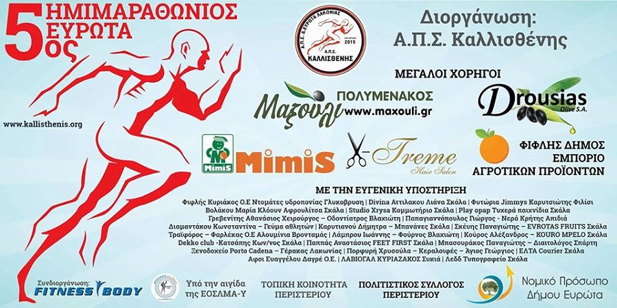 Ο Α.Π.Σ Καλλισθένης διοργανώνει τον 5ο Ημιμαραθώνιο Ευρώτα και τους παράλληλους αγώνες 10, 5 και 1χλμ παιδικός αγώνας “Τριαντάφυλλος” στις 14 Ιανουαρίου 2018, ημέρα Κυριακή, ώρα έναρξης εκδήλωσης 9:00 π.μ , στο Περιστέρι Δήμου Ευρώτα Λακωνίας.