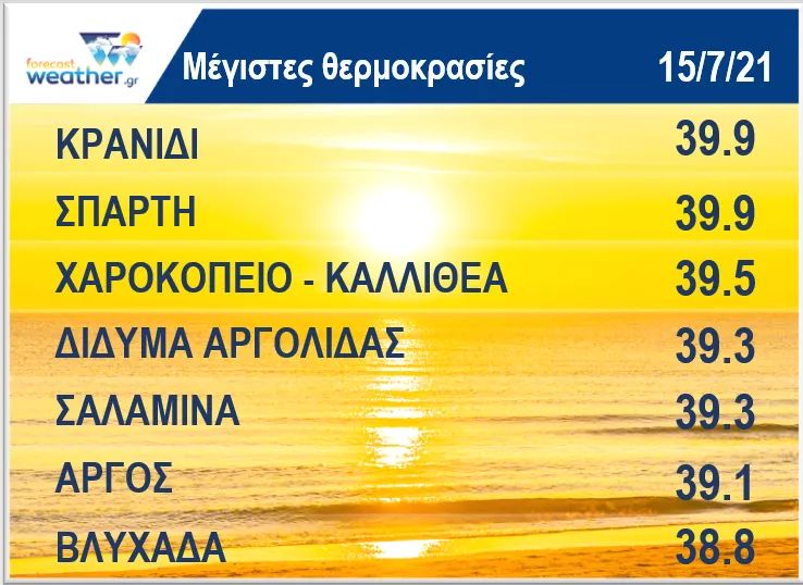 Η Σπάρτη και την Πέμπτη ήταν στην κορυφή μοιράζοντας την 1η θέση με το Κρανίδι με 39.9 βαθμούς Κελσίου. Καίγανε τα τσιμέντα η ατμόσφαιρα αποπνικτική πουθενά να σταθείς και οι πιο πολλοί σε κοντινές παραλίες για λίγη δροσιά.