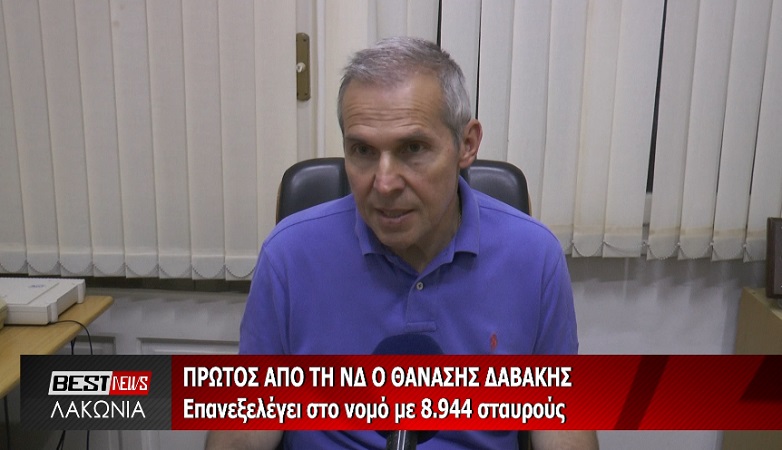 Οι πρώτες δηλώσεις του Βουλευτή ΝΔ Λακωνίας Θανάση Δαβάκη ο οποίος επανεξελέγει πρώτος στο νομό και κράτησε τα ποσοστά του με 8.944 σταυρούς. Οι δηλώσεις έγιναν τα ξημερώματα της Δευτέρας όταν το εκλογικό αποτέλεσμα είχε κλειδώσει από το γραφείο του στην Σπάρτη. Ρεπορτάζ Ιωάννης Παυλάκος