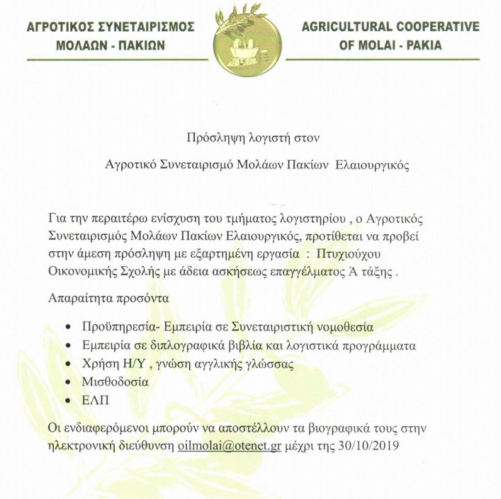 Αγγελία πρόσληψης λογιστή από τον Αγροτικό Συνεταιρισμό Μολάων – Πακίων