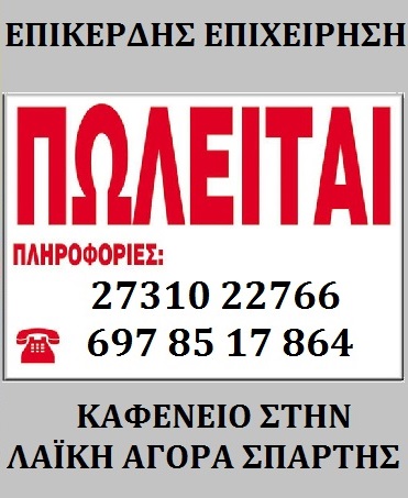 Πωλείται επικερδής επιχείρηση στη Σπάρτη Πωλείται λόγω αλλαγής επαγγελματικής σταδιοδρομίας επικερδής επιχείρηση – Καφενείο στη Σπάρτη. Η επιχείρηση βρίσκεται σε προνομιακή θέση παραπλέυρως της Λαϊκής Αγοράς Σπάρτης επι των οδών Λεωνίδου και Βρασίδου γωνία. Η επιχείρηση διαθέτει όλες τις νόμιμες άδειες όπως επίσης και όλο τον απαιτούμενο εξοπλισμό λειτουργίας για άμεση έναρξη εργασιών. Καφετιέρα είδη… Continue reading Πωλείται επικερδής επιχείρηση στη Σπάρτη