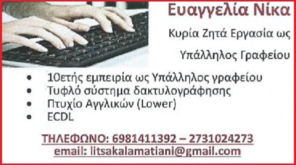 Απόφοιτη ΙΕΚ – Ειδικός Μηχανογραφημένου Λογιστηρίου με πτυχίο Αγγλικών, κάτοχος ECDL και με γνώσεις Τυφλού συστήματος δακτιλογράφησης ζητά εργασία ως υπάλληλος Πληροφορίες 6981411392 και 27310 24273