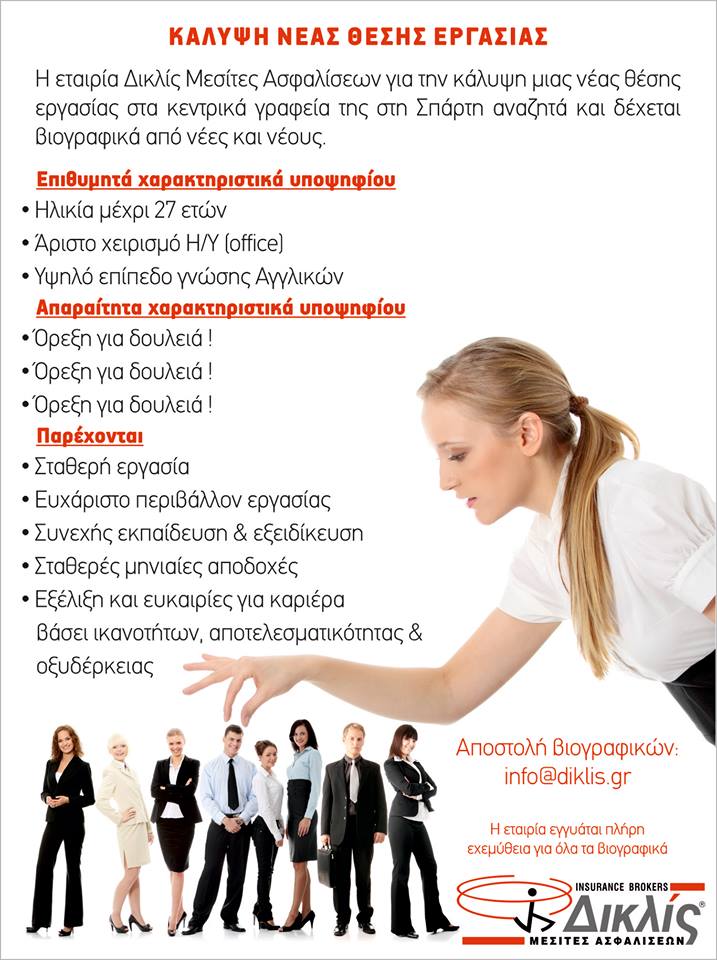 Θέση εργασίας στην “Δικλίς” Σπάρτης… Η κάλυψη της θέσης αφορά τα κεντρικά γραφείς της Σπάρτης. Απαραίτητα χαρακτηριστικά υποψηφίου… “Όρεξη για δουλειά” Αποστολή βιογραφικών στο [email protected] Δείτε τα στοιχεία..