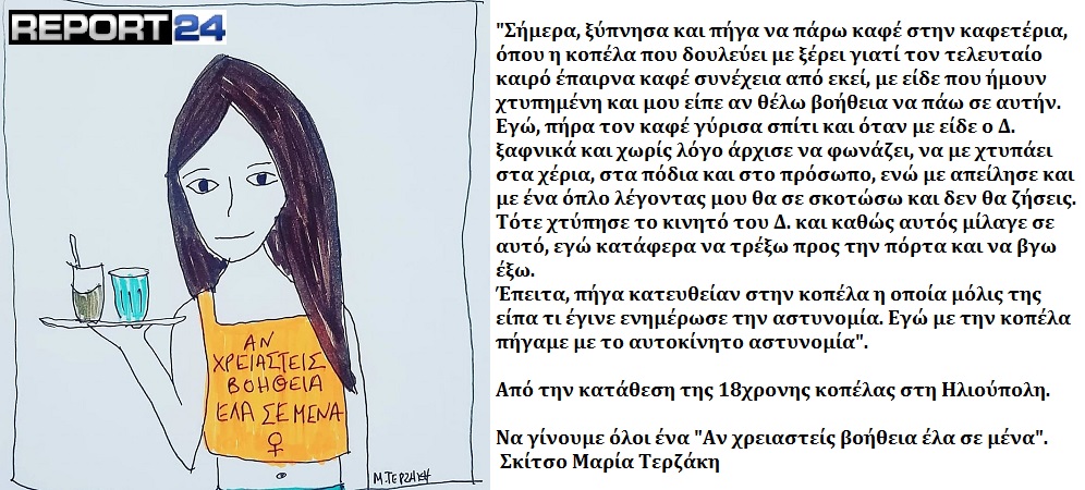 “Σήμερα, ξύπνησα και πήγα να πάρω καφέ στην καφετέρια, όπου η κοπέλα που δουλεύει με ξέρει γιατί τον τελευταίο καιρό έπαιρνα καφέ συνέχεια από εκεί, με είδε που ήμουν χτυπημένη και μου είπε αν θέλω βοήθεια να πάω σε αυτήν. Εγώ, πήρα τον καφέ γύρισα σπίτι και όταν με είδε ο Δ. ξαφνικά και χωρίς… Continue reading “Αν χρειαστείς βοήθεια έλα σε μένα” Το κοινωνικό μήνυμα για την 18χρονη στην Ηλιούπολη