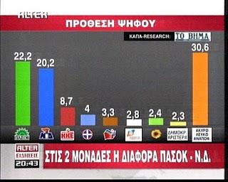 Σύμφωνα με τη δημοσκόπηση στην πρόθεση ψήφου τα κόμματα εμφανίζονται να συγκεντρώνουν τα εξής ποσοστά: ΠΑΣΟΚ 22,2%, νδ 20,2%, ΚΚΕ 8,7%, ΛΑΟΣ 4, ΣΥΡΙΖΑ 3,3%, Δημοκρατική Συμμαχία 2,8%, Δημοκρατική Αριστερά 2,3%, Οικολόγοι – Πράσινοι 2,4% και Άκυρο – Λευκό 30,6%.