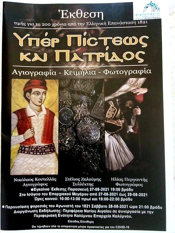Η Έκθεση Υπερ Πίστεως και Πατρίδος για τα 200 χρόνια από την Ελληνική Επανάσταση ταξιδεύει από την Σπάρτη στην Κάλυμνο. Με αναφορά στην Αγιογραφία στα Κειμήλια και στην Φωτογραφία από τους Νικόλαο Κουτελλά Στέλιο Ζαλούμη και Ηλία Περγαντή.